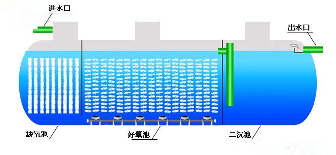 一體化污水處理設備是將一沉池、I、II級接觸氧化池、二沉池、污泥池集中一體的設備,并在I、II級接觸氧化池中進行鼓風曝氣,使接觸氧化法和活性污泥法有效的結合起來,節省了找人設計污水處理工藝和做基礎建設的繁瑣。